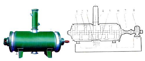 具有结构简单,操作方便,使用周期长,性能稳定可靠,蒸汽耗量小,适用性能强,产品质量好,特别适用于不耐高温、易燃、调温下易氧化的膏状物料的干燥,该机经用户长期使用证明是一良好的干燥设备。原理:被干燥物料从壳体上方正中间加入,在不断正反转动的耙齿的搅拌下,物料轴向来回走动,与壳体内壁接触的表面不断更新,受到蒸汽的间接加热,耙齿的均匀搅拌,粉碎棒的粉碎,使物料表面水分更有利的排出,气化的水分经干式除尘器、湿式除尘器、冷凝器,从真空泵出口处放空。结构:真空耙式干燥机的主要部件